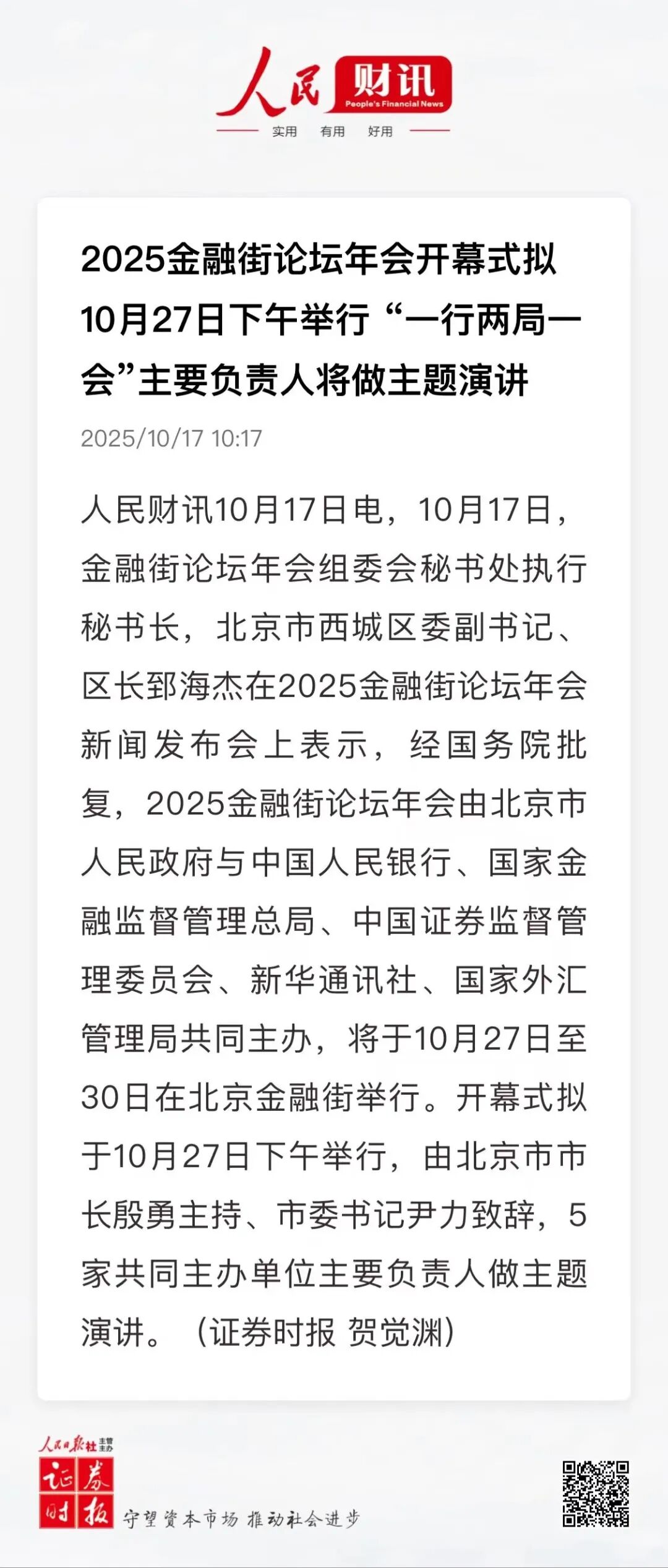 10月17日,金融街论坛年会组委会秘书处执行秘书长,北京市西城区委副书记、区长郅海杰在2025金融街论坛年会新闻发布会上表示,经国务院批复,2025金融街论坛年会由北京市人民政府与中国人民银行、国家金融监督管理总局、中国证券监督管理委员会、新华通讯社、国家外汇管理局共同主办,将于10月27日至30日在北京金融街举行。开幕式拟于10月27日下午举行,由北京市市长殷勇主持、市委书记尹力致辞,5家共同主办单位主要负责人做主题演讲。